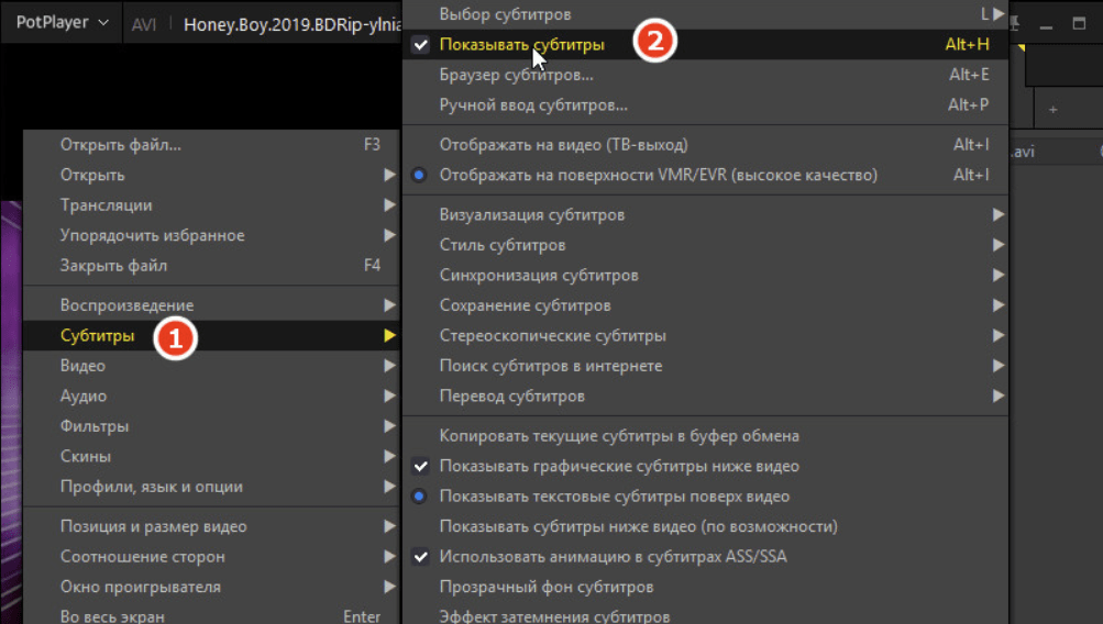 В PotPlayer субтитры открывают возможность смотреть фильм с оригинальной озвучкой и текстом, который будет переводить происходящее на экране. Можно включать или выключать эту функцию. Его создатели предусмотрели возможность воспроизведения разных форматов видео и аудио, а также минимального редактирования файлов в рамках изменения кодеков, добавления субтитров и т.д.